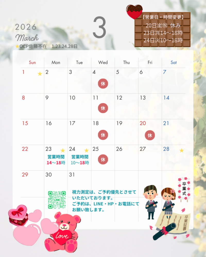 ⭐️印は、佐藤真子不在日となります。☆が付いていない日も不在になる場合がございますので、事前にご確認ください。